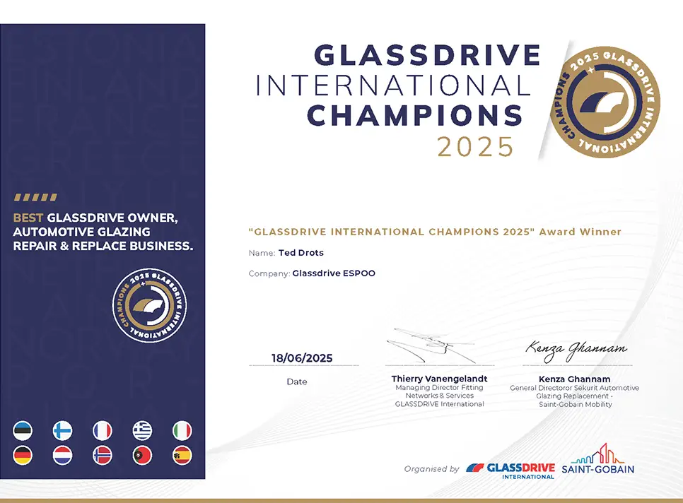 Tuulilasikorjaamo Ted’s Garage Oy on perustettu 2005 ja palvelemme Espoossa Suomenojalla. Olemme valtuutettu Novus tuulilasikorjaamo ja kuulumme GlassDrive asennusketjuun. Tuulilasin vaihdossa käytämme tehdasalkuperäisiä Saint-Gobain Sekurit ja Pilkington varaosalaseja (OEM). Lisäksi teemme ikkunoiden tummennuksia.